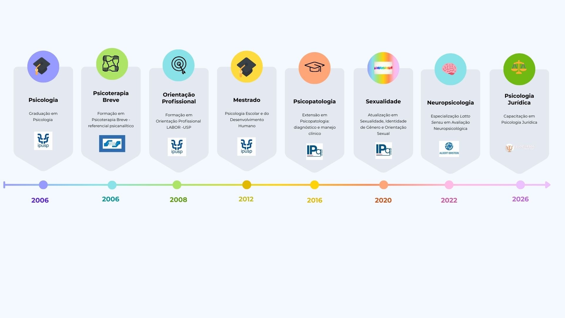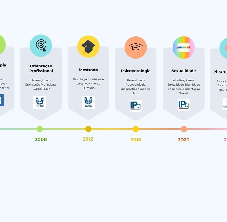 Formada pela Universidade de São Paulo (USP) em 2006, onde também concluí meu mestrado na área de Psicologia Escolar e do Desenvolvimento Humano (2012), tenho especialização em Neuropsicologia pela Faculdade Israelita de Ciências da Saúde Albert Einstein (2022). Minha formação é complementada por cursos nas áreas de sexualidade, psicopatologia, proteção da infância, saúde mental LGBTQIA+, prevenção de autolesão e suicídio, e psicanálise.